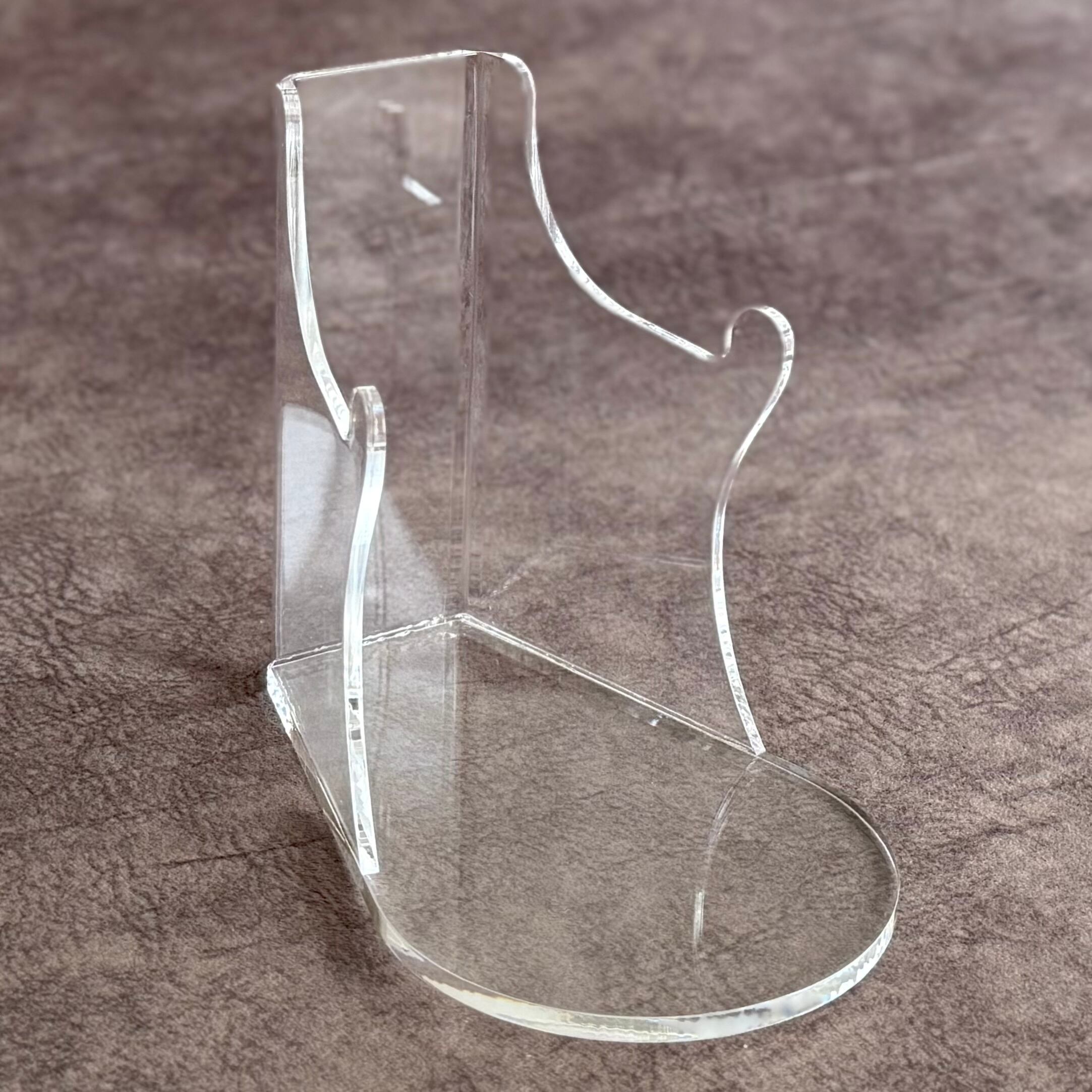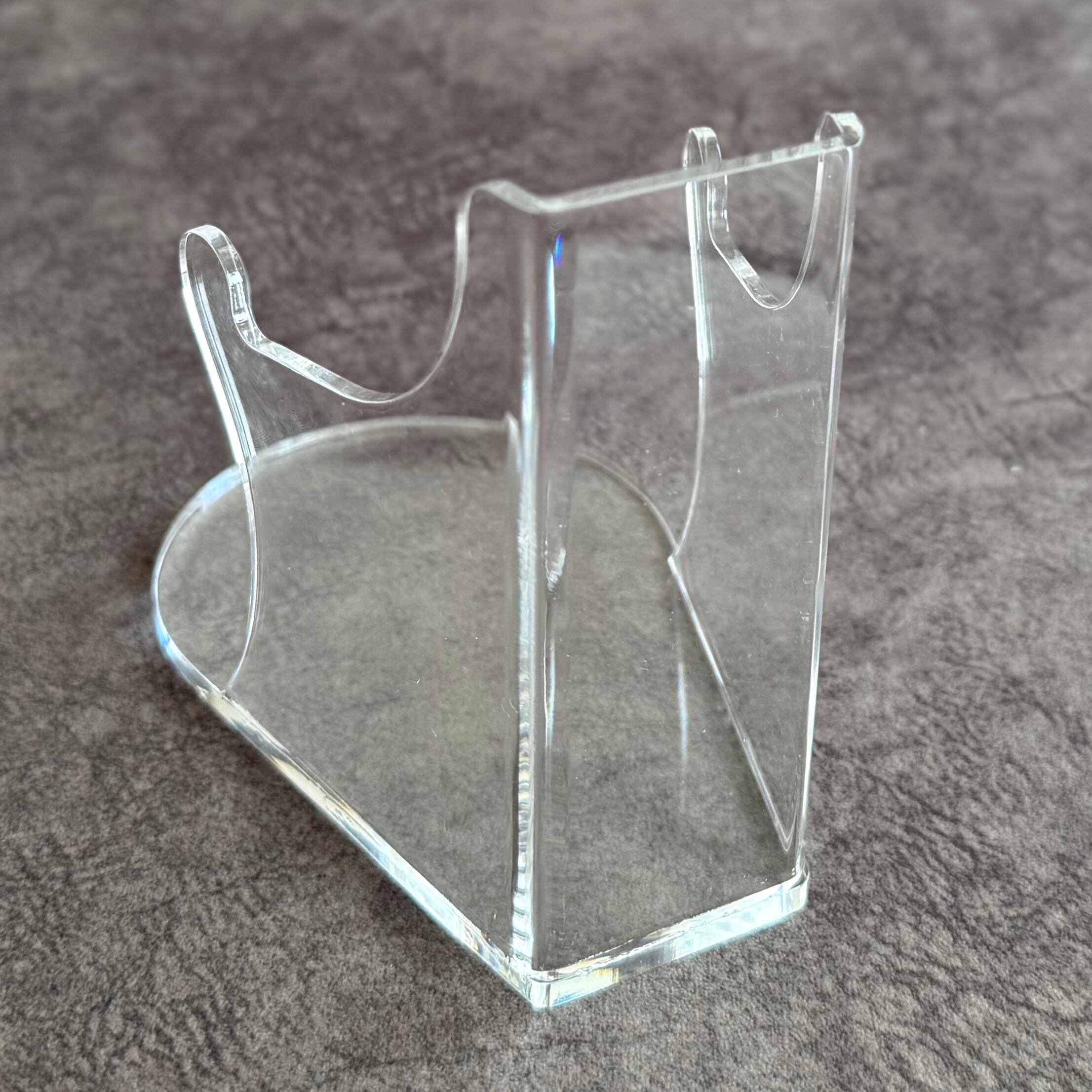 発案は30年以上前に類似型のスタンドを特注し、愛用されていた同業者様で、新たにブラッシュアップした型をアクリル什器専門店様へ依頼し、製作していただいた品を当店にて販売させていただくことになりました。