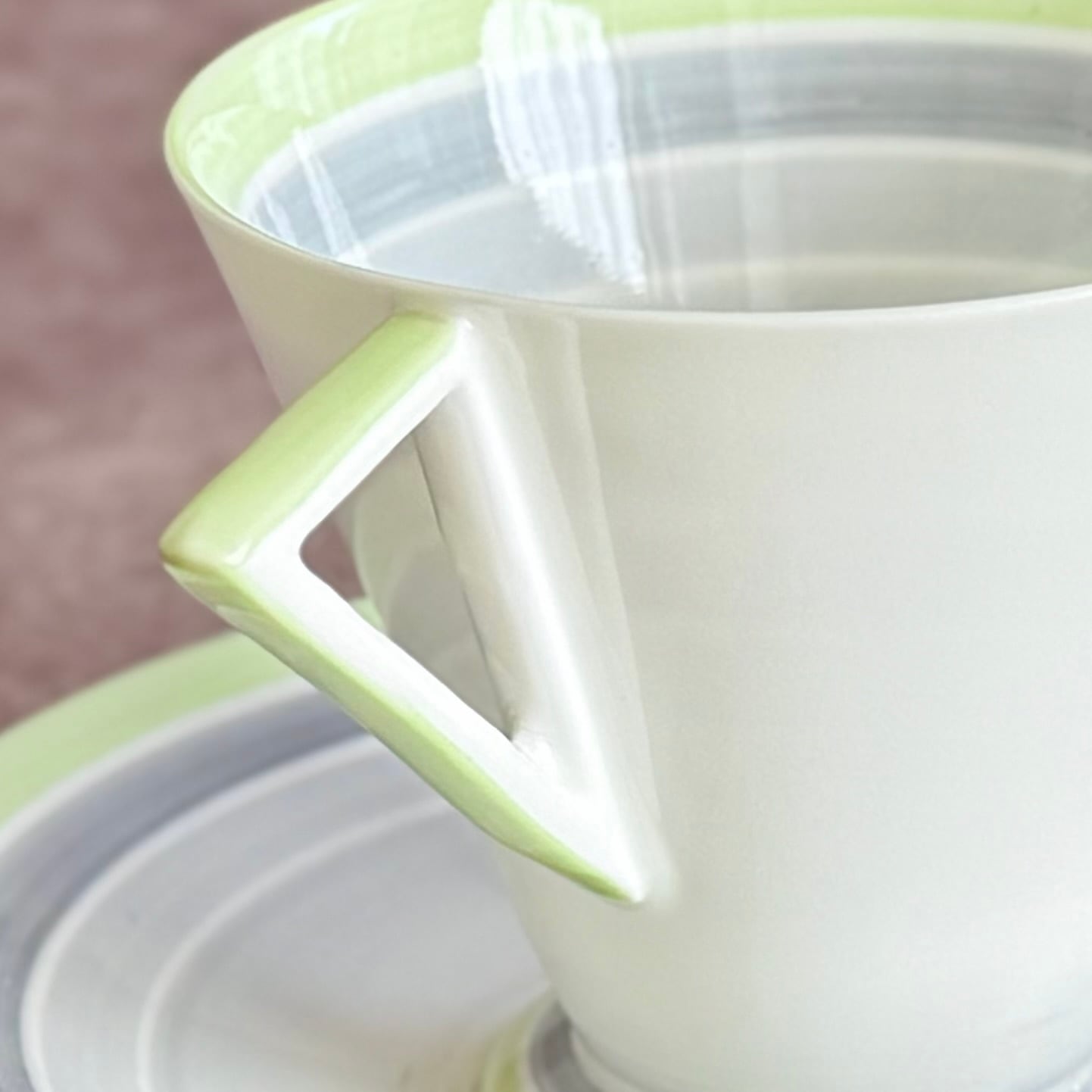 薄造りで直線的で端正な美しいシェイプの磁胎に、ライトグリーンとグレーのグラデーションのボーダー。彩色は手仕事によって施されています。
