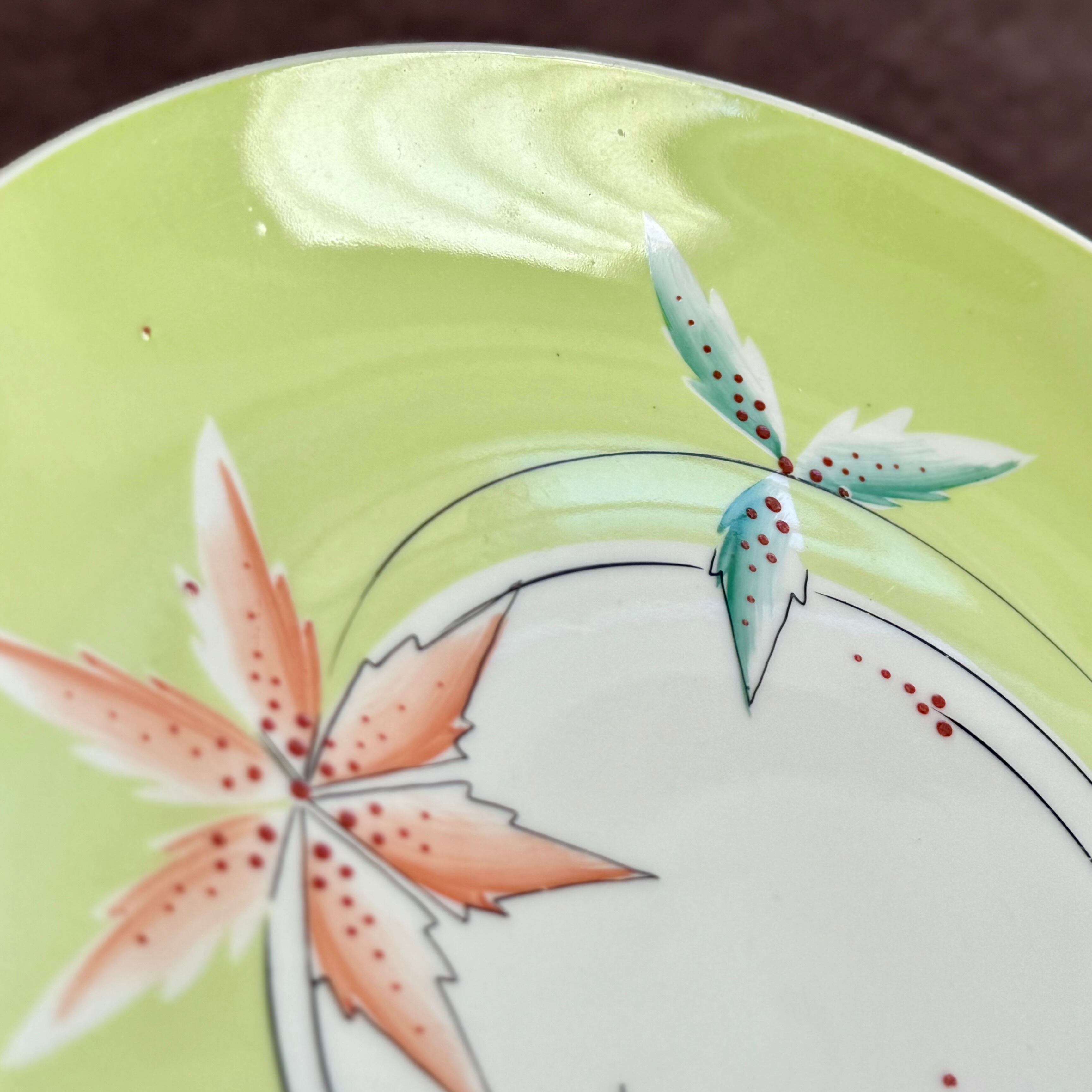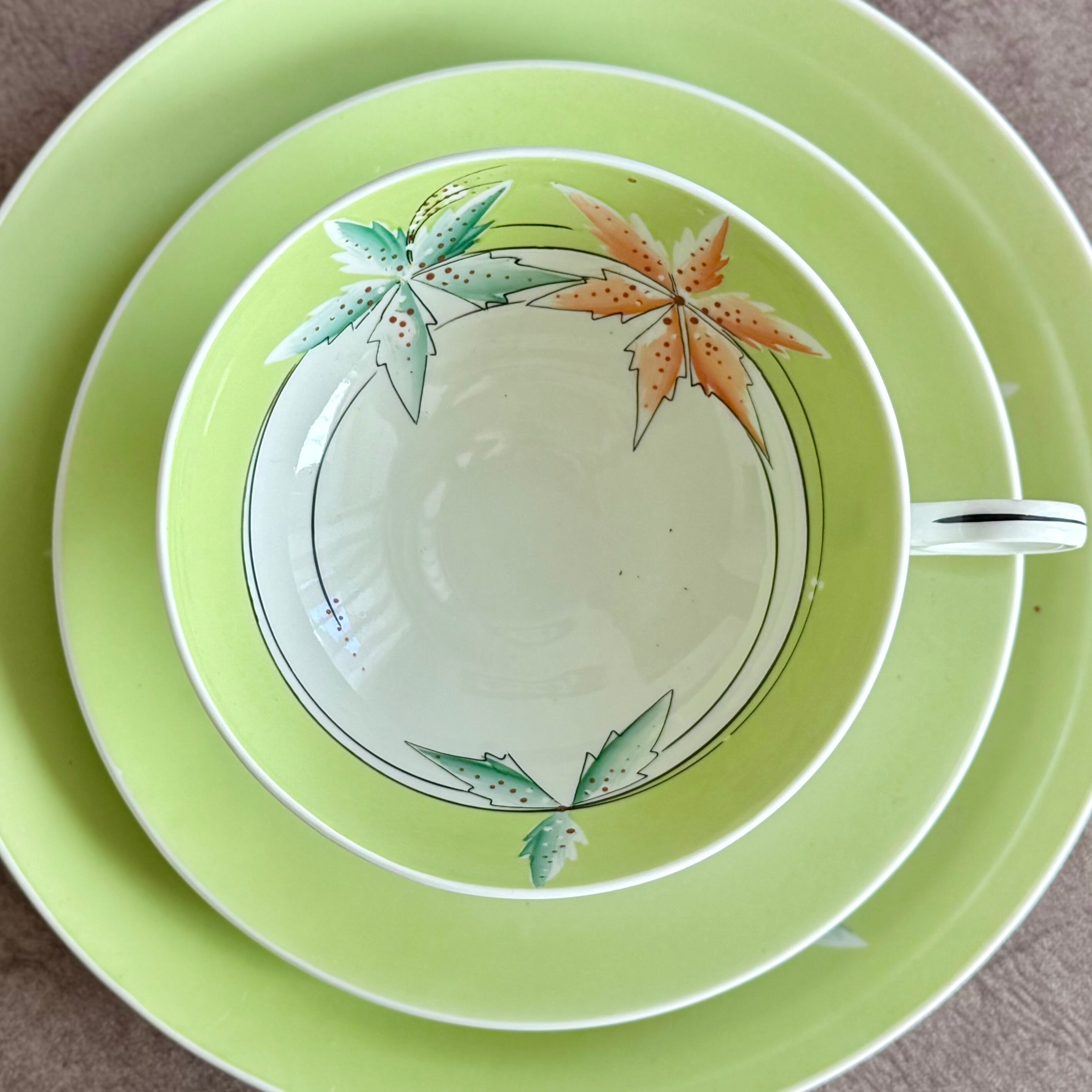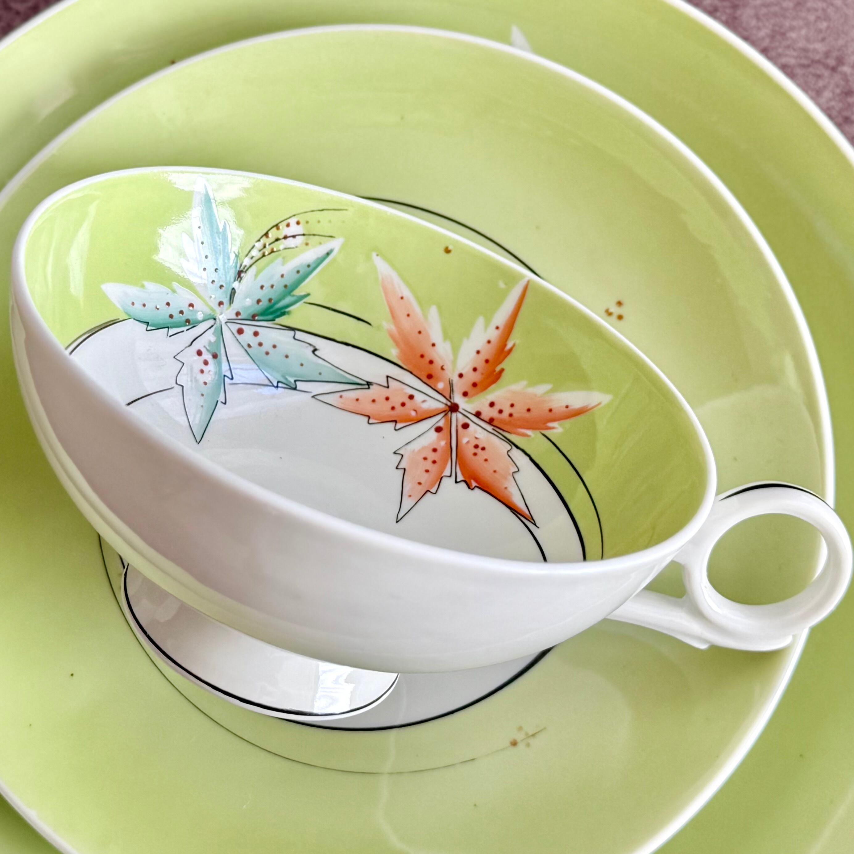 硬質磁器製の磁胎に艶やかなライムグリーン地、紅葉をモチーフとした意匠、赤のジュール。絵付は全て手描によって施されています。