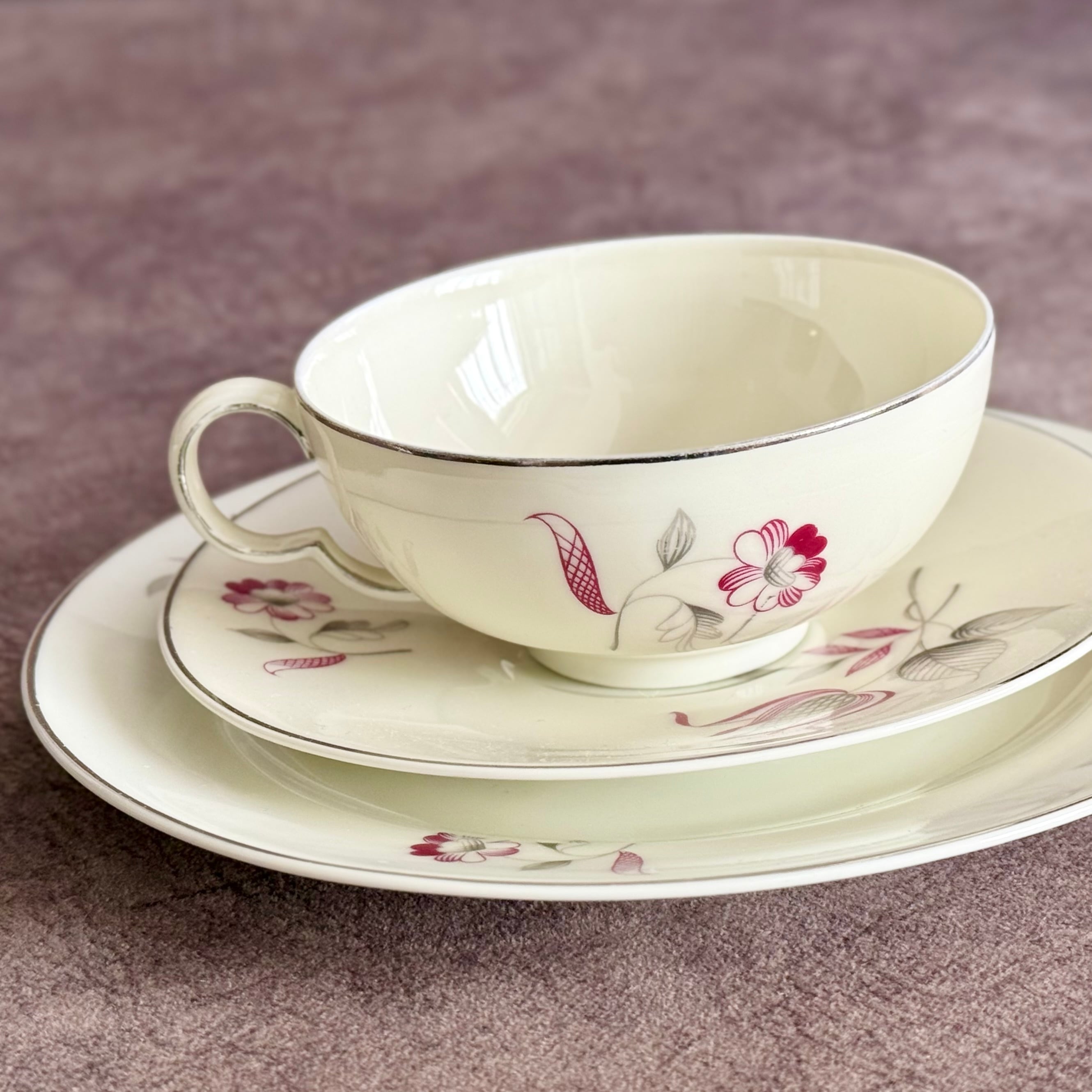 アイボリーの釉薬がかけられた磁胎に、抽象化された植物文の意匠。縁にはプラチナ彩が施されています。