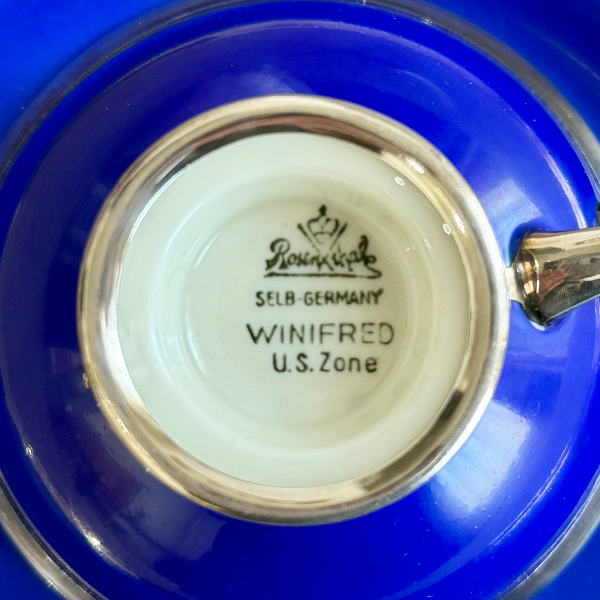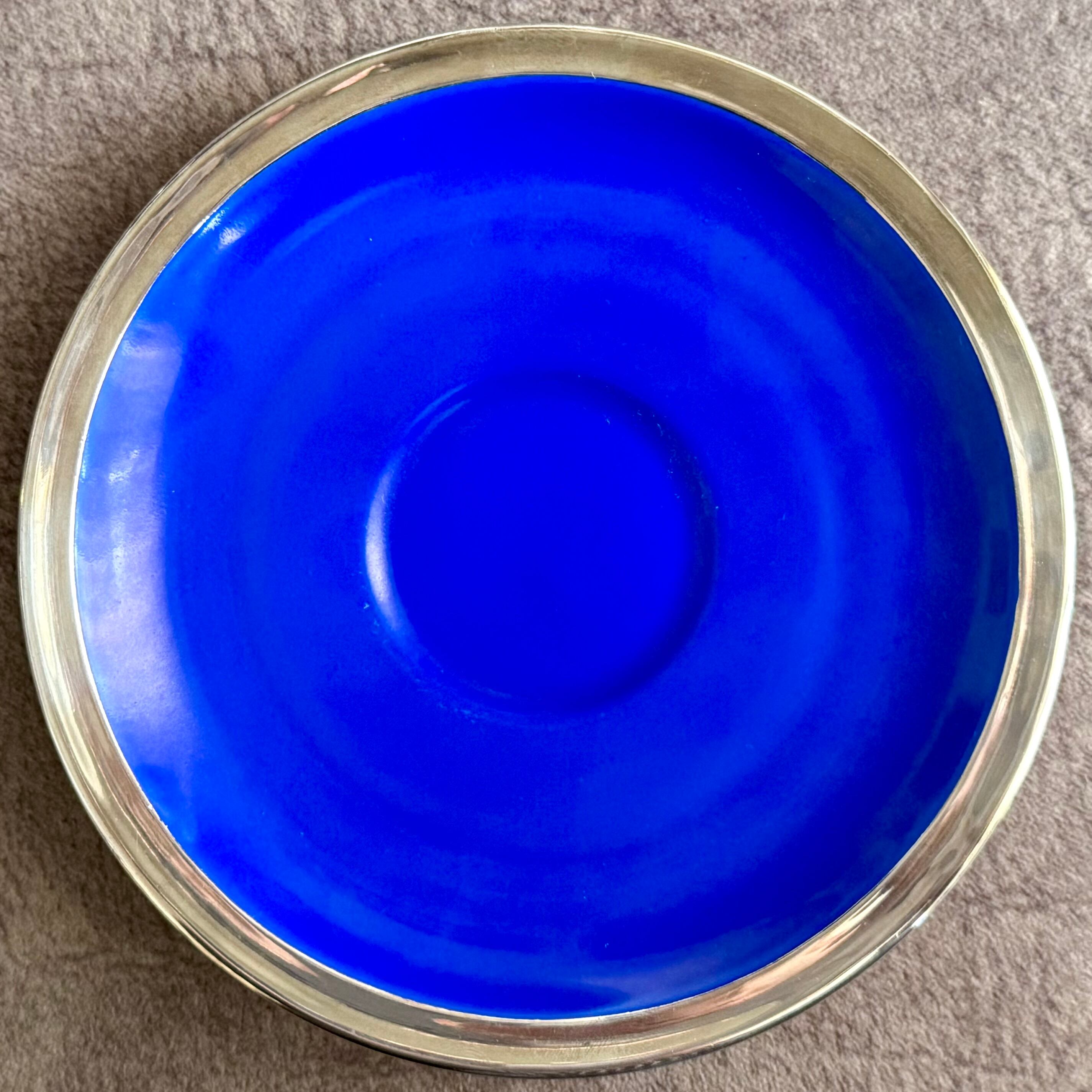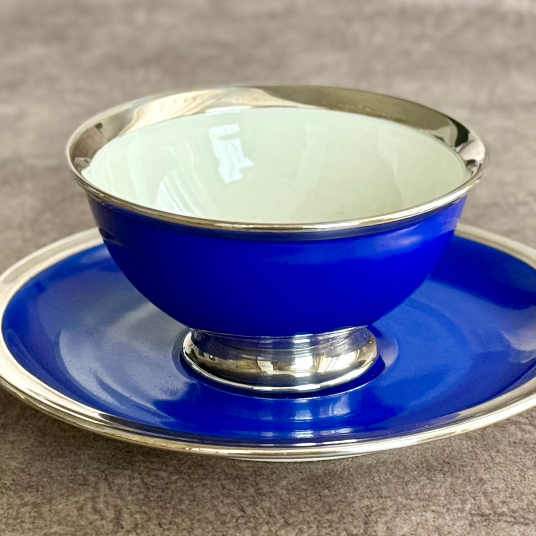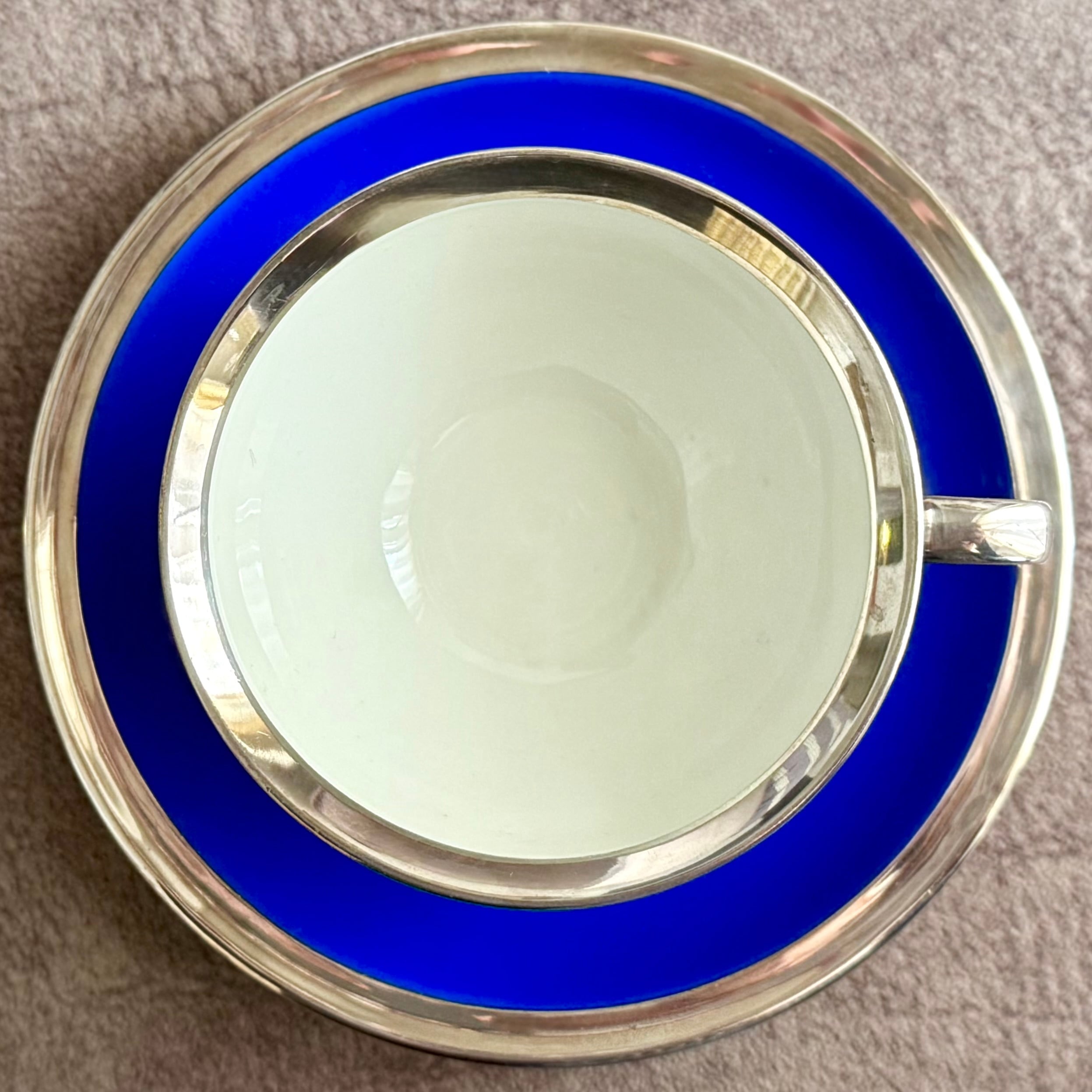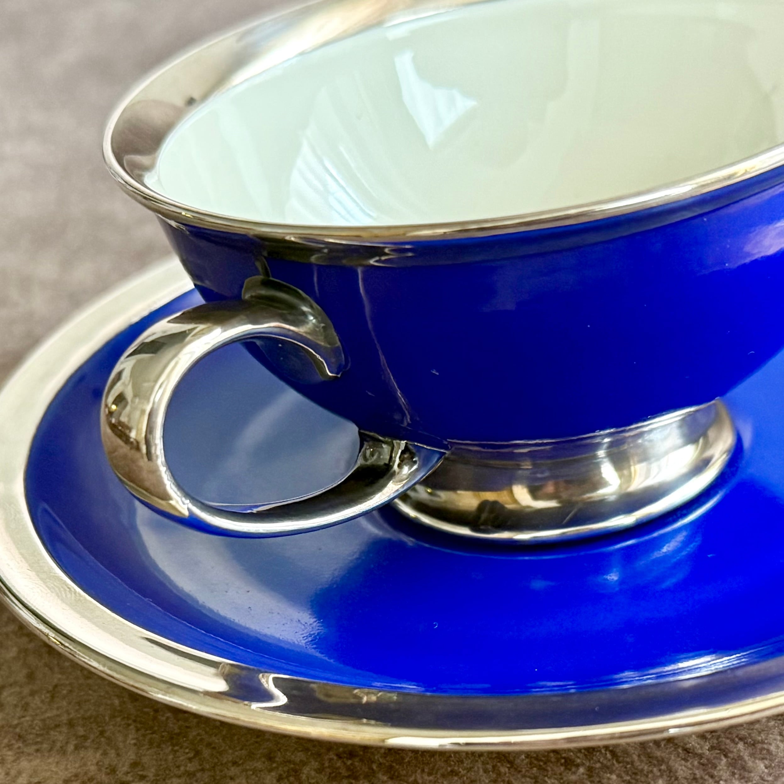 アイボリーチャイナ製の磁胎に群青地の彩色と、縁とハンドルには銀が巻かれています。
