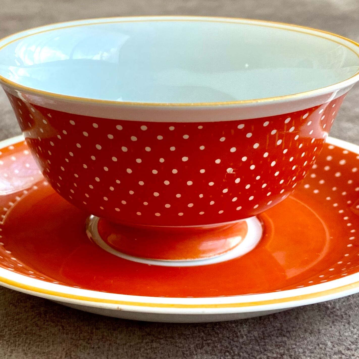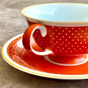 戦前にアメリカに渡った品です。朱色の彩色は東陶でよく見られる装飾の一つですが、こちらは白抜きで小さなドット模様が表現され、縁には明るいオレンジの彩色がされたとてもモダンな印象の一客です。