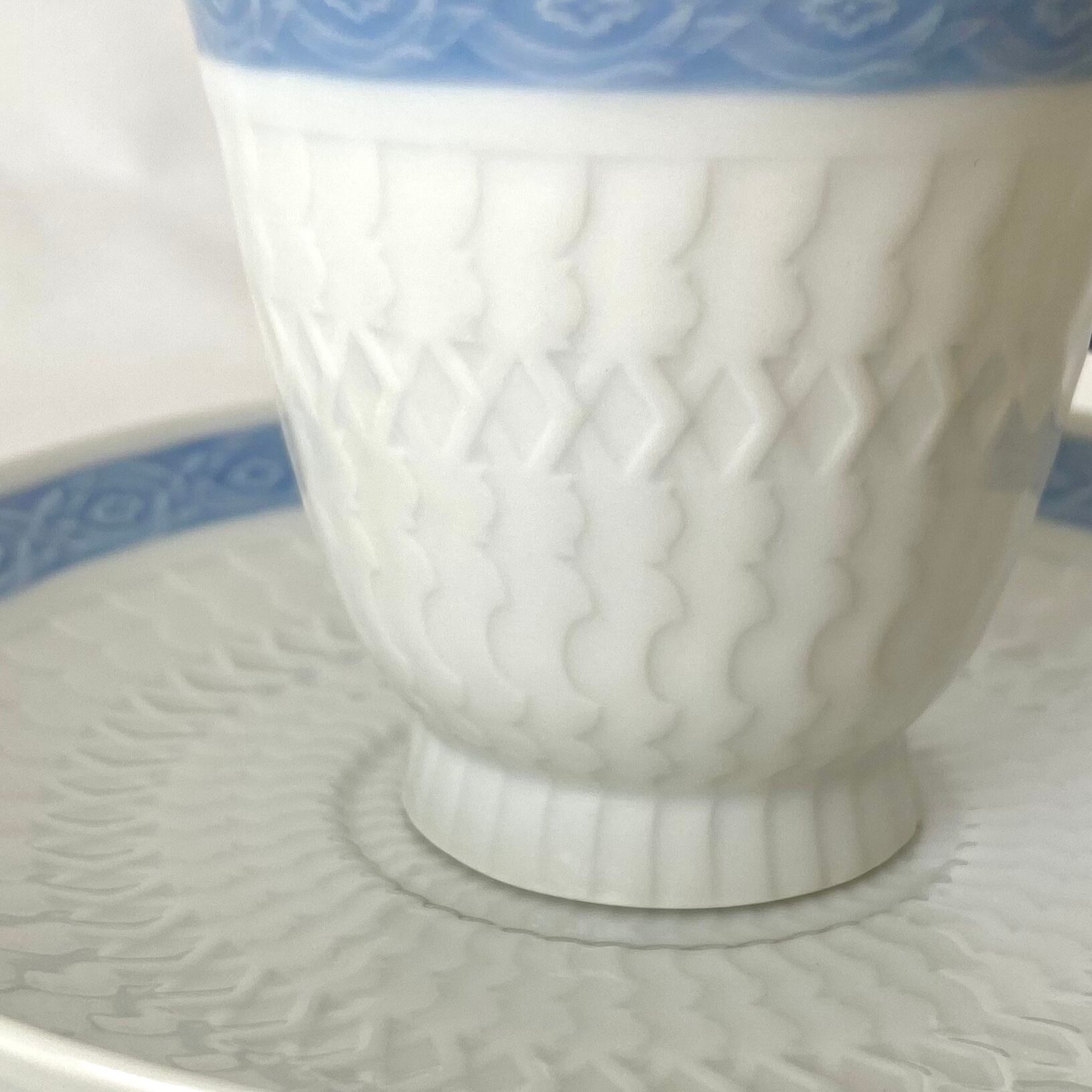 アールヌーヴォーテイストのレリーフ模様が非常に美しいシリーズで、薄造りの磁胎に釉下彩色が施されています。上品かつ爽やかな雰囲気を纏った一客と思います。