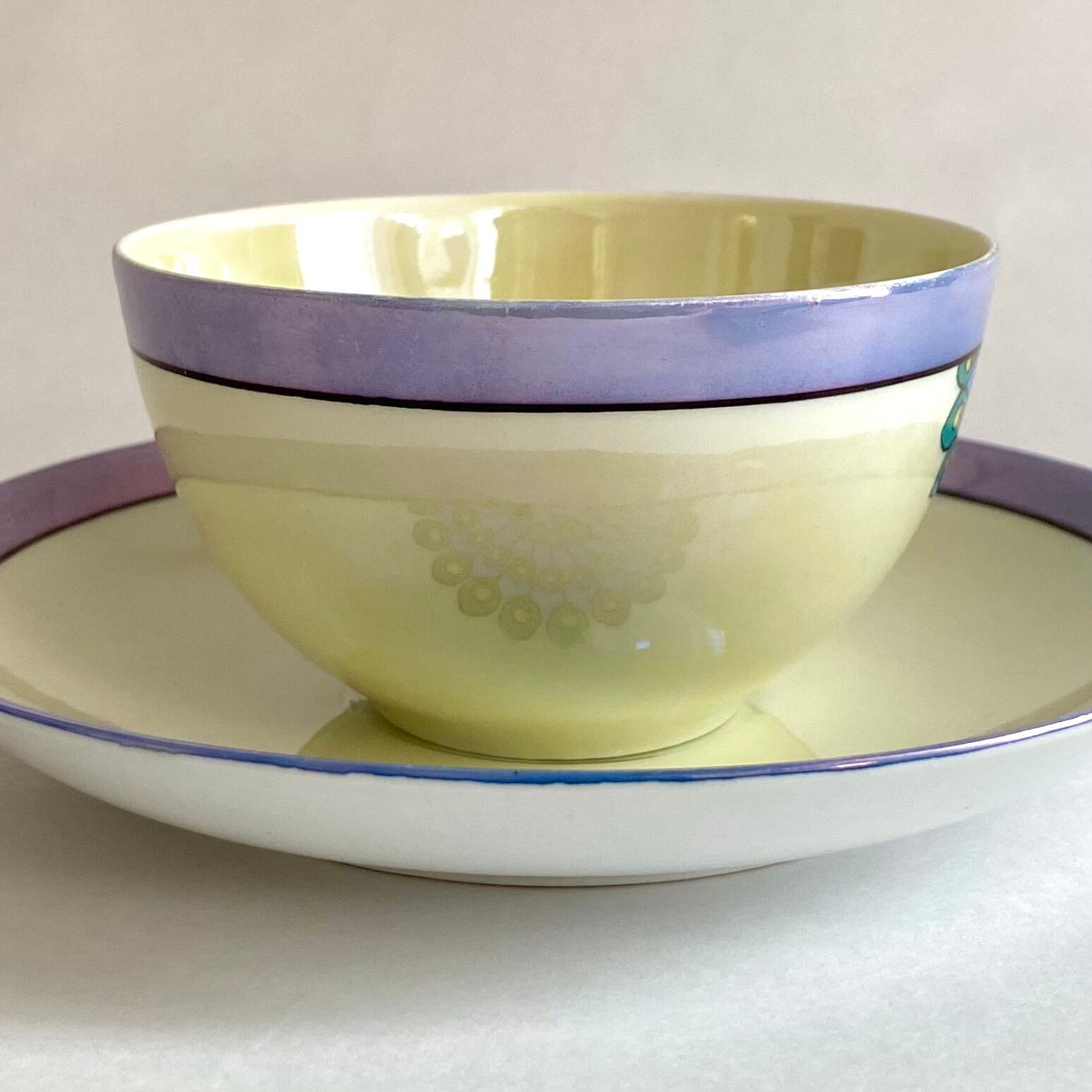 薄造りの磁胎には、鮮やかなラスター彩が全面に施され、カップ正面とソーサー2箇所に孔雀の羽を想わせる紋様が手描きによって施されています。