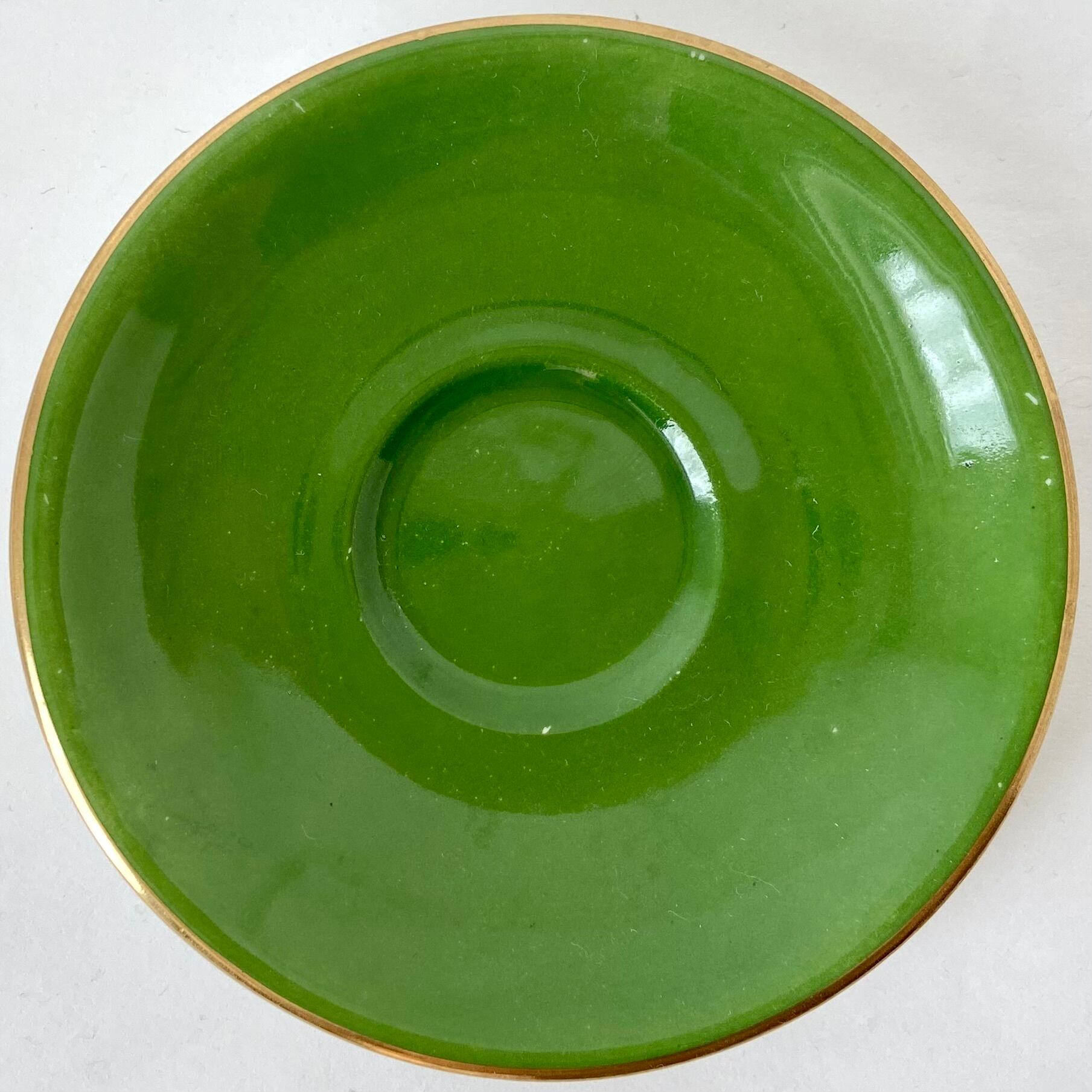 ボーンチャイナ製の薄造りで美しい磁胎に深緑の彩色が施されたシンプルな意匠です。